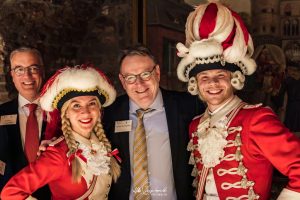 Ein farbenfroher Höhepunkt des Abends war die symbolträchtige Einkleidung des Kölner Oberbürgermeister und der neuen Mitglieder: Das Tanzpaar der Kölsche Funke rut-wieß vun 1823 e.V., Elena Stickelmann und David Eßer, überreichte Burmester und zehn weiteren neuen Fördervereinsmitgliedern Krawatte, Einstecktuch und Reversnadel – unverkennbare Zeichen der Zugehörigkeit zu einer der geschichtsträchtigsten kölschen Institutionen.