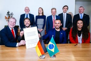 V.l.n.r.: Christoph Kuckelkorn mit Eduardo Araujo „Dudu Menor“, Evelyn Bastos und Daniel Calarco