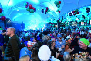 Schon beim Betreten des Saals war klar: Hier beginnt die „fünfte Jahreszeit“ nicht einfach – hier ist sie genetisch verankert! Bunte Lichtwellen tauchten Decke und Bühne in ein festliches Leuchten, während die ersten Takte von „DJ Jürgen“ (Bender) Kölschen Remix-Hits die Menge in Bewegung setzten. Das Publikum – viele in phantasievollen Kostümen, Glitzerjacken, Narrenkappen und blinkenden Accessoires – war von der ersten Sekunde an im Feiermodus.