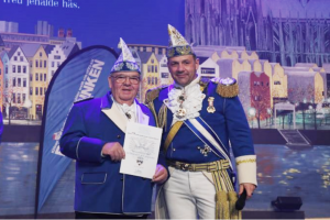 Es folgten zwei Ehrungen für eine jeweils sehr lange Mitgliedschaft. So konnte Björn Griesemann den ehemaligen Tanzoffizier Ernst Wilfried Neuland mit dem Treueorden in Gold mit Brillanten für eine 40jährige ununterbrochene Mitgliedschaft auszeichnen und der ehemalige Bauer im Dreigestirn 1996 Ewald Kappes erhielt für seine 50jährige Mitgliedschaft den Treueorden in Gold mit Brillanten und gekreuzten Säbeln.