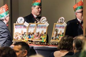 Ratspräsident und Konditor René Weber fertigte für diesen Abend Gemälde der drei Tollitäten und von Nelson Müller vollständig aus Schokolade und Pralinen an. Die Übergabe dieser besonderen Geschenke war ein Höhepunkt des Abends.