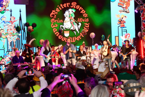Der zweite Teil stand ganz im Zeichen von Tanz und Musik. Die Tänzerinnen und Tänzer der Lyskircher Junge sorgten mit ihren schwungvollen Darbietungen für Begeisterung, bevor gleich vier bekannte Kölner Bands den Saal endgültig zum Kochen brachten. „Miljö“, „Bläck Fööss“, „Rabaue“ und „Kempes Feinest“ im Finalteil lieferten einen Hit nach dem anderen und verwandelten den Ostermann-Saal in ein Meer aus schunkelnden, singenden und feiernden Jecken aus zahlreichen Kölner Karnevalsgesellschaften.