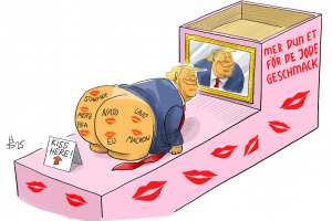 Dieses Motiv ist dem „König von Amerika“ gewidmet und seiner sehr besonderen Art, Hof zu halten. Während sich früher europäische Würdenträger mit einem Kuß des Rings oder der Füße die Ehre erwiesen ließen, heißt es bei Trump: „Man möge ihn am Arsche küssen!“ Und wo Selenskyj noch denkwürdig antwortete: „Du mich auch!“ kommen FIFA, NATO, EU und viele mehr willfährig angekrochen. Warum, ist schwer zu sagen. Vielleicht schmeckt das präsidiale Gesäß sogar?